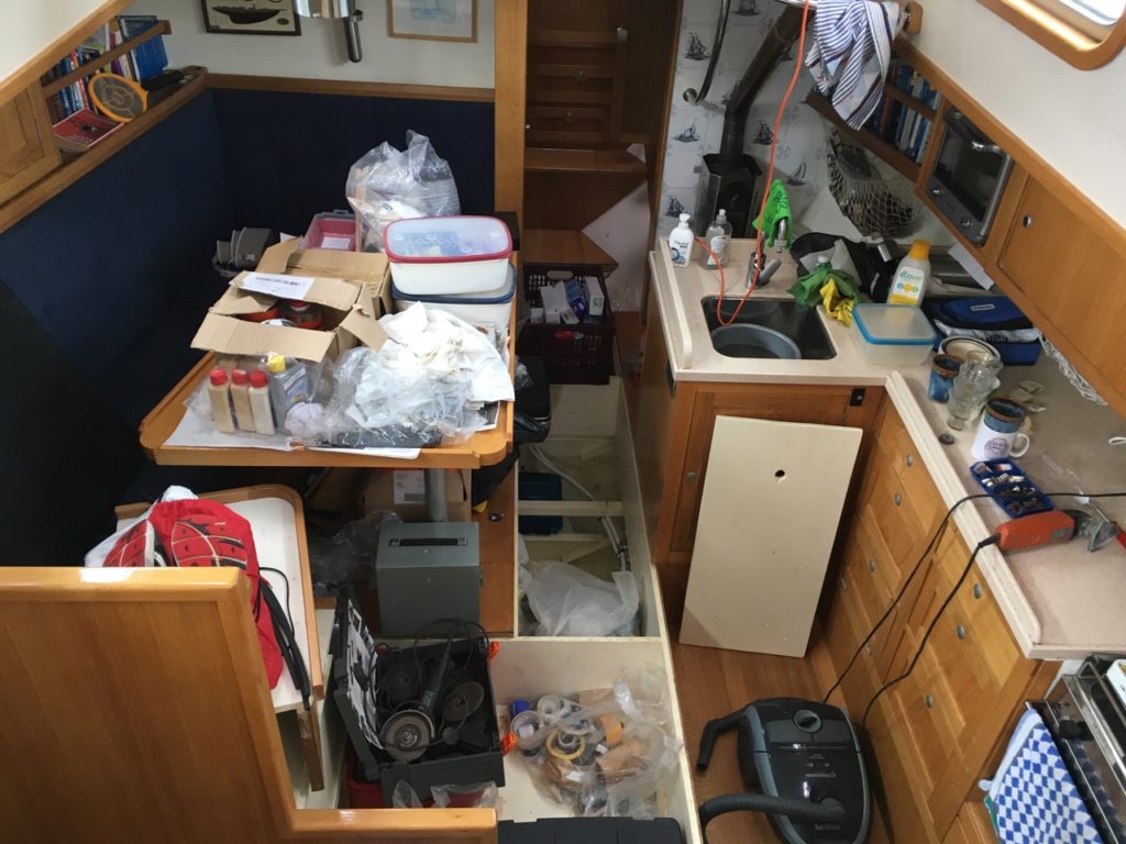 Before the underwater-ecosystem slows us down too much, Luci’s bottom gets new layers of Seajet primer and bright-red antifouling paint. We also replace some zinc anodes to prevent electrical corrosion and install Herbie’s new auxiliary rudder. Finally, we treat the rusty spots on the hull and deck. The rust below the wooden planks on the edges of the cockpit is more difficult to remove, but we also get that done.