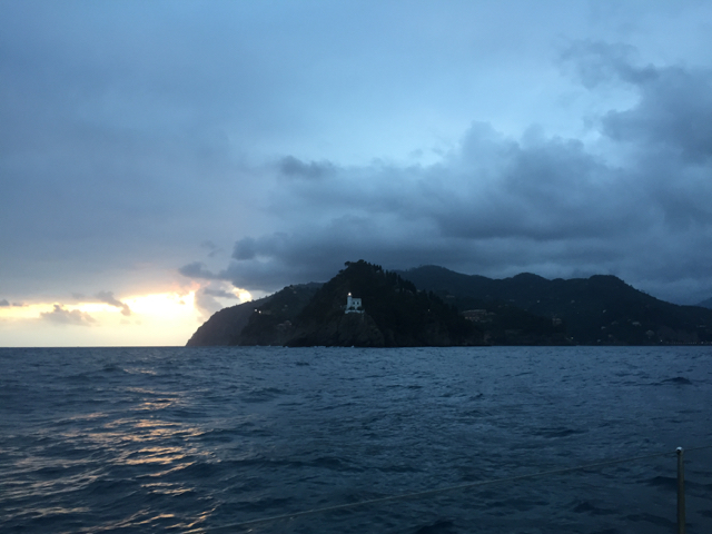 Slowly but surely we are closing in on Portofino. As evening falls, the town’s lighthouse is lit just when we pass it. We head for the bay of Paraggi around the corner and find ourselves the only boat at the anchorage. In the last daylight we throw out the anchor and are happy to have made it, even if it took longer than expected.