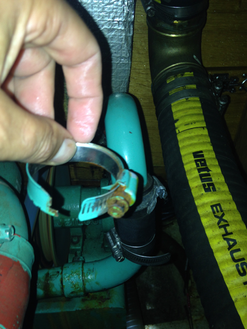 After around 15 minutes the coast guard boat arrives, followed by the marina harbour boat. They hand us a big hose and switch on their pump. That helps! In no time all the water is out. Wow, that’s a big relief! But we still haven’t found the leak. Together with the harbourmaster, who’s also a mechanic, we open the cooling water inlet and start the engine. Water is gushing in. The source seems to be the engine cooling water pump. Upon further inspection we find a leak where the hose connects to the pump. A hose clamp is broken. Relieved that we found the leak, we replace the broken hose clamp and start the engine again. Not a drop of water is leaking now. This still leaves the question why the automatic bilge pump didn’t work. We check it and find a broken wire.