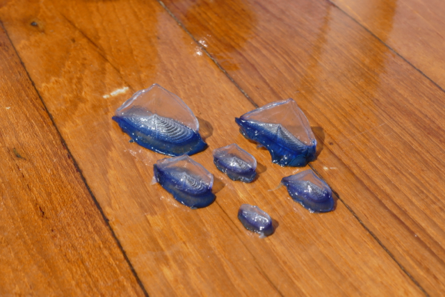 Relief comes with the first daylight. The wind returns and we can sail again. The monotone humming of the engine is replaced by blissful sounds of the wind and waves. We keep an eye open for dolphins, but are treated to quite a different phenomenon. Thousands upon thousands of transparent, oval-shaped objects, about the size of bottle caps float around the boat. Is it plastic litter? Sadly, we have seen various forms and shapes of it, wherever we sailed. Yet this is different. There are so many of them, they form kilometre-long carpets. In true Darwin style Ivar catches some for further examination. They are soft like jellyfish and from their base, a blue oval disc, a transparent triangle rises up vertically. It makes them look like little sailing boats, quite spectacular. We continue to see them everywhere on the water surface and are determined to learn more about this intriguing natural phenomenon.
