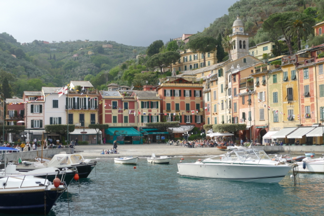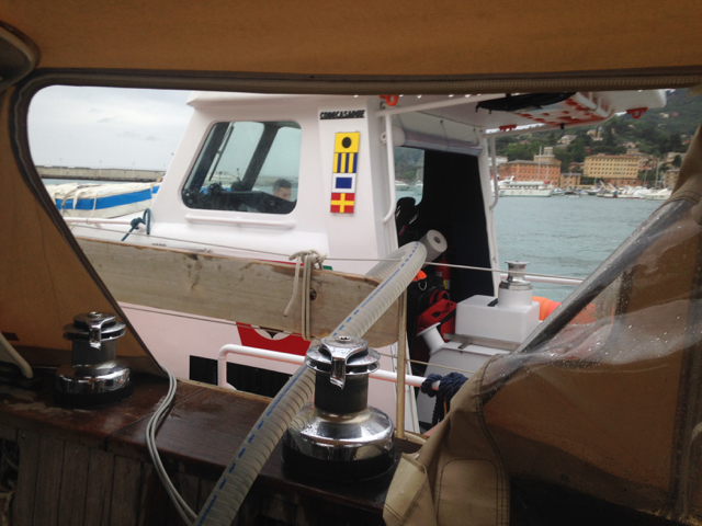 The next morning during our breakfast in the sun, a coast guard boat approaches us. They explain – in fluent Italian – that we are inside the protective area, as marked by a yellow buoy. To us the anchoring demarcation wasn’t very clear, but the coast guard leaves no room for misinterpretation. They ask us to leave “adesso” (now), in a friendly but firm tone, and wait for us to pull up the anchor. We are allowed to anchor beyond the yellow buoy, but that’s outside the protection of the bay and 18 meters deep. We decide to move to the nearby town of Santa Margherita Ligure instead.
