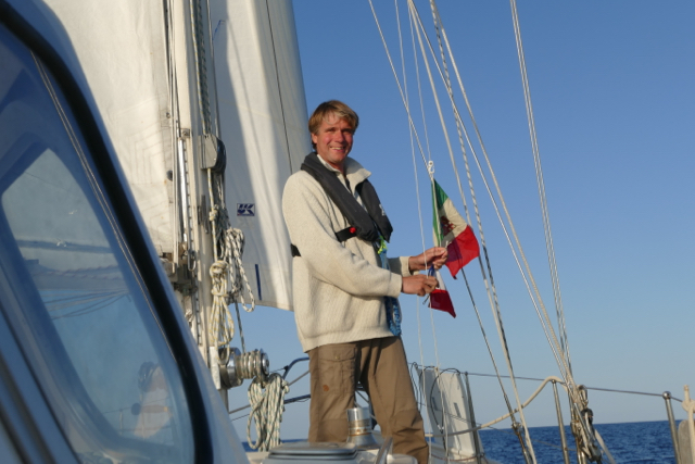 Before midday the wind decreases again and we go back to snail speed. The VHF keeps us entertained. The Italian Coast Guard is on it, non-stop. Not because of an on-going search and rescue operation, but because it seems to call all ships in the area. Sure enough, soon it’s our turn! The station calls us on VHF channel 16 and we respond. Just a radio check. Okay, bye. An hour later, we’re called again. Another radio check! Wow, these guys take their traffic-monitoring role quite seriously.