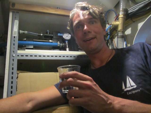 A day after Ivar’s family heads back north, the weather improves and the swell abates. To save costs we plan to move to the anchorage next to the harbour. Before we leave the marina, we fill up our fresh water tank. That takes quite some time; we didn’t realize that it was so empty. We start the engine, leave our berth and head towards the anchorage. Just as we’re finalizing our anchoring manoeuvres, an engine alarm sounds. Ivar checks the instrument panel and sees a red light indicating a temperature problem. Probably overheating, perhaps a lack of coolant? But the engine temperature is very low, off the scale low actually. Very strange, we’ve never seen this before. Ivar stops the engine, takes off the bonnets and looks at… water. Lots of water! The entire bilge is full of this fluid that surely belongs outside of the boat!