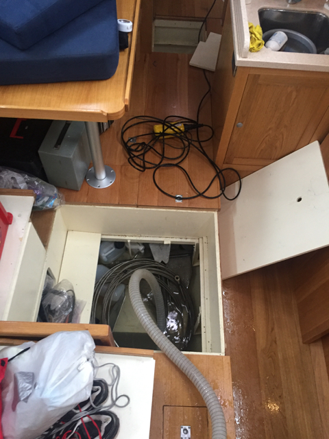 We immediately switch on the electric bilge pump, and start investigating. There’s lots of water in the front bilge too, the level is just below the cabin floor. How did all this water come in? Think fast. Could it be a leak in the fresh water system? Floris dips his finger and tastes the water. It’s salty, so no doubt about its origin. But where’s the leak? Could it be the toilet? The sink? The engine? The propeller or rudder shaft? Or even a hole in our hull? Floris starts to operate our manual bilge pump, but we are unsure if our pumps are keeping up with the water intake and start to get really worried. We call the Santa Margherita Ligure Coast Guard on the VHF for help and explain our situation. They reply immediately and promise assistance.