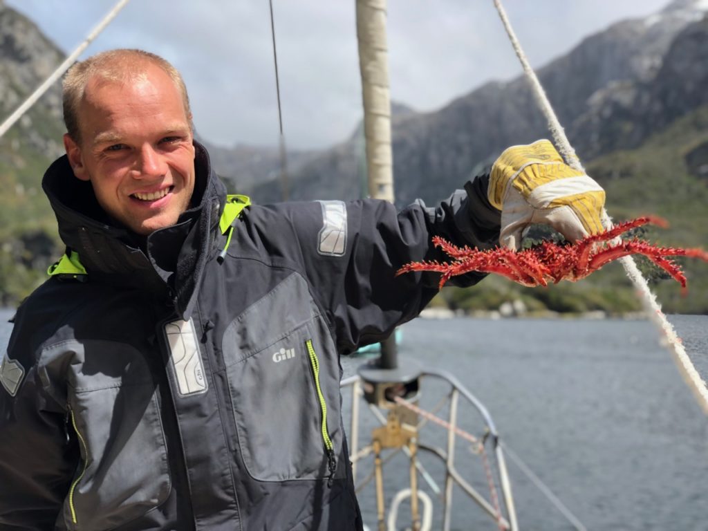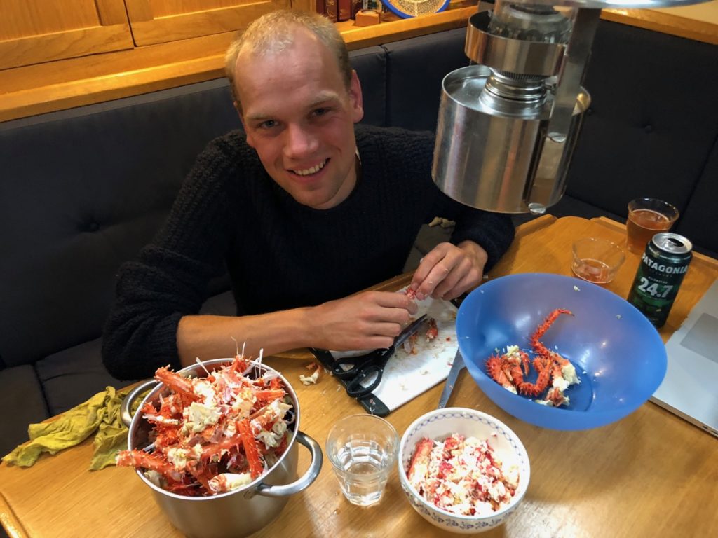 A week flies by. During our hiking expeditions we not only discover stunning lakes, waterfalls, forests, condors and countless types of moss, we also start to recognize our own trails. Mussels the size of avocados grow on every rock and although they look tempting, eating them is dangerous due to the red tide disease. The king crabs (centollas) are not affected by this, so Lars goes on a mission. He constructs a crab trap from the plastic crates he collected close to Caleta Horno. Using opened mussels as bait, he indeed manages to catch them. Although the thorny red crabs look big from a Dutch perspective, they don’t seem to be very meaty. So Lars goes on setting his crab cage until he has caught seven. Their legs make a nice salad. “Delicious! You’re our Chief Crab Officer now”, Ivar compliments him.