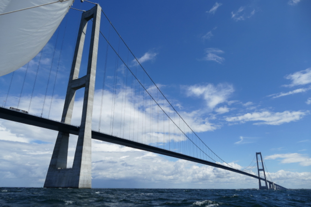 From Nyborg, it’s a daytrip to reach the island of Samsø, the destination of our next sustainable solution. We pass one of Denmark’s largest bridges spanning the “Big Belt”, the waterway separating the islands of Fyn and Sjælland. It’s impressive to see the traffic rushing by on a road 65 meters above our heads. With the wind being W4, we make good progress. Cumulus shower clouds grow on the horizon and one of them is directly in our way. The rain is quite heavy, but the luckily wind gusts stay away. The sun reappears just as we pass Samsø’s offshore wind turbines. We reach the lee of the island, so the wind dies down and soon thereafter we moor up in Ballen, Samsø’s main harbour.