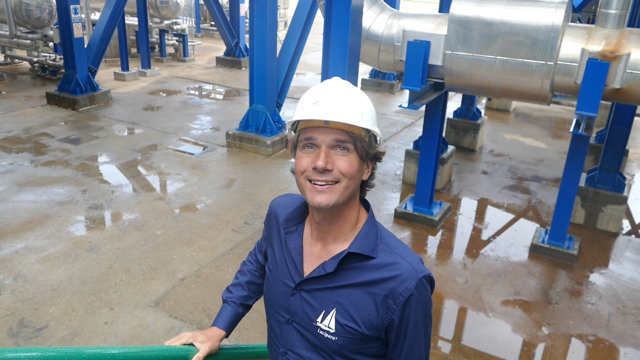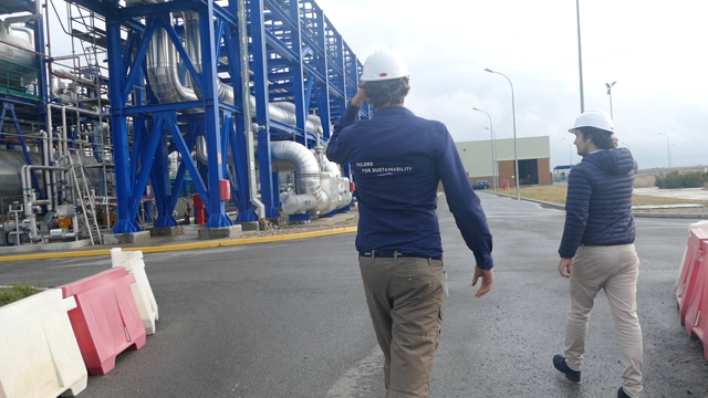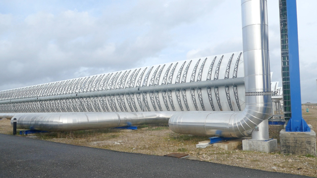 So how does it work? We visit a CSP plant in Palma del Rio, between Seville and Córdoba to find out. Engineer Andrés Lastra explains it to us while leading us along large, curved mirrors. Andrés points at an arm-thick pipe which runs in front of the mirrors. “Synthetic oil flows through the pipes. The mirrors reflect the sunlight and concentrate it on these pipes, which heats the oil to almost 400 degrees Celsius. The hot oil turns water into steam, which drives turbines to generate electricity.”