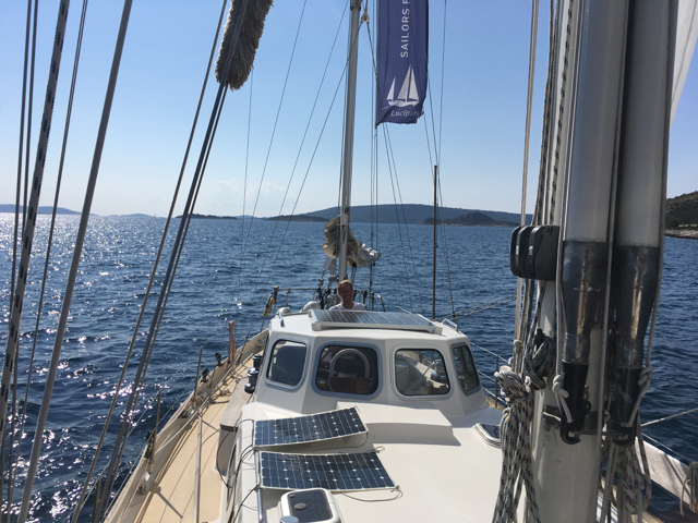 We sail along the Andalusian coast under a sunny sky. Good news for the temperature and energy production on board. The photovoltaic (PV) cells in our three solar panels turn the solar energy into power and charge the on-board batteries. It’s a proven method, but still under development. To illustrate, our two-year old solar panels supply more electricity than the four-year panel, which is considerably larger. They were cheaper, too.