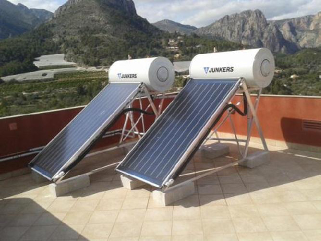 Since we have started paying attention to them, we have seen them everywhere: solar water heaters on roof tops. They look like solar panels with a tank above it. Water flows through the panel, is heated by the sun and then stored in an insulated tank. In other words solar energy is stored in the form of hot water, which can be used in the bathroom or kitchen. To encourage the transition to solar energy, solar boilers are required by law for all renovations and new constructions in Spain.