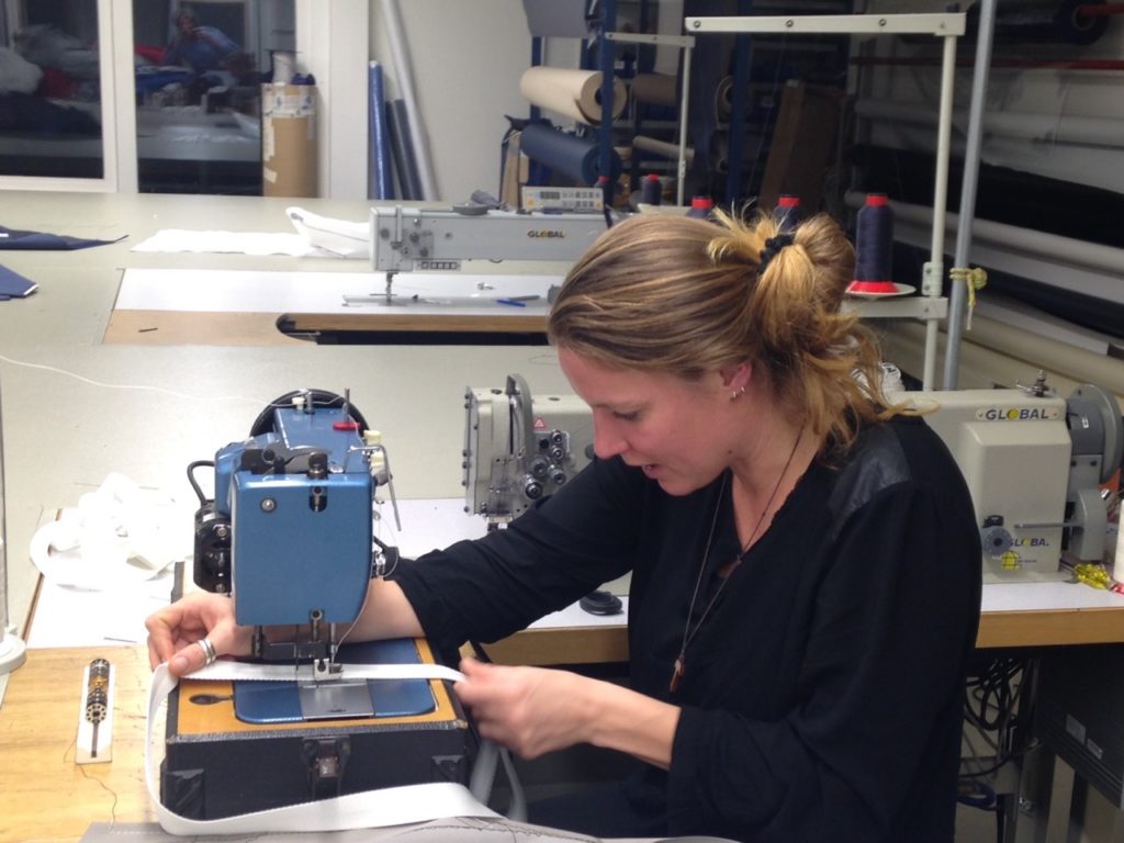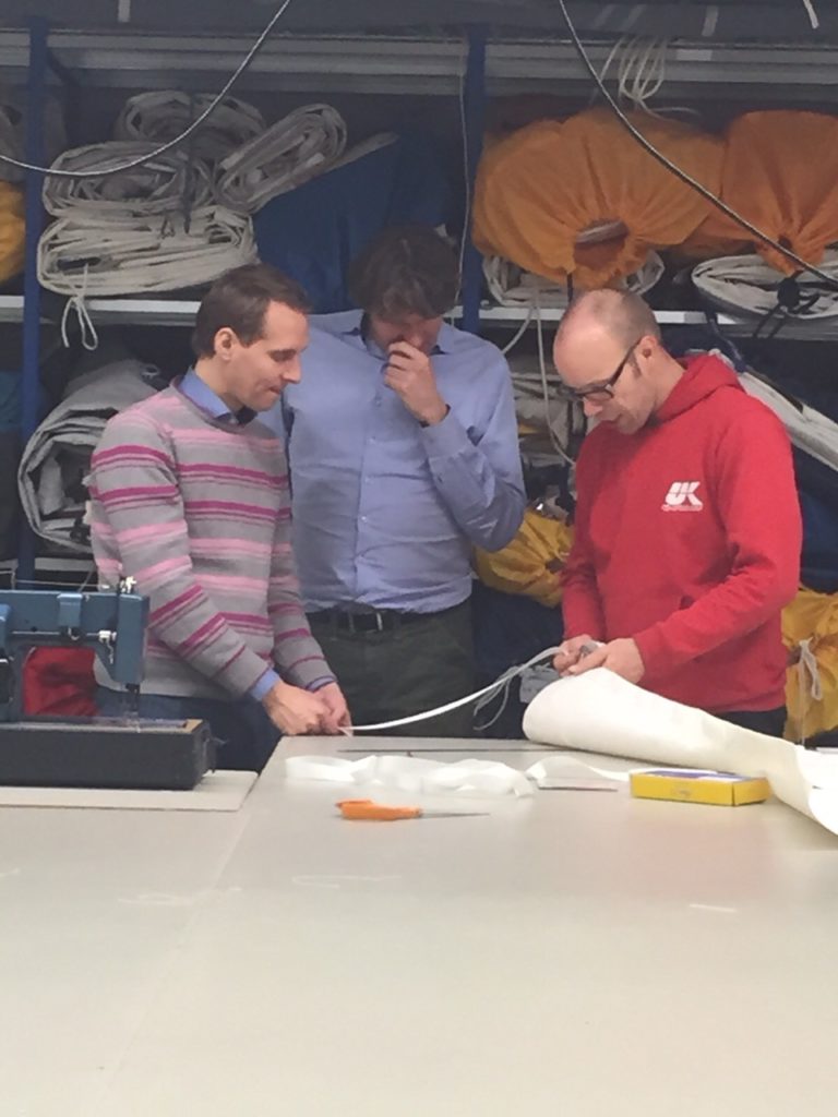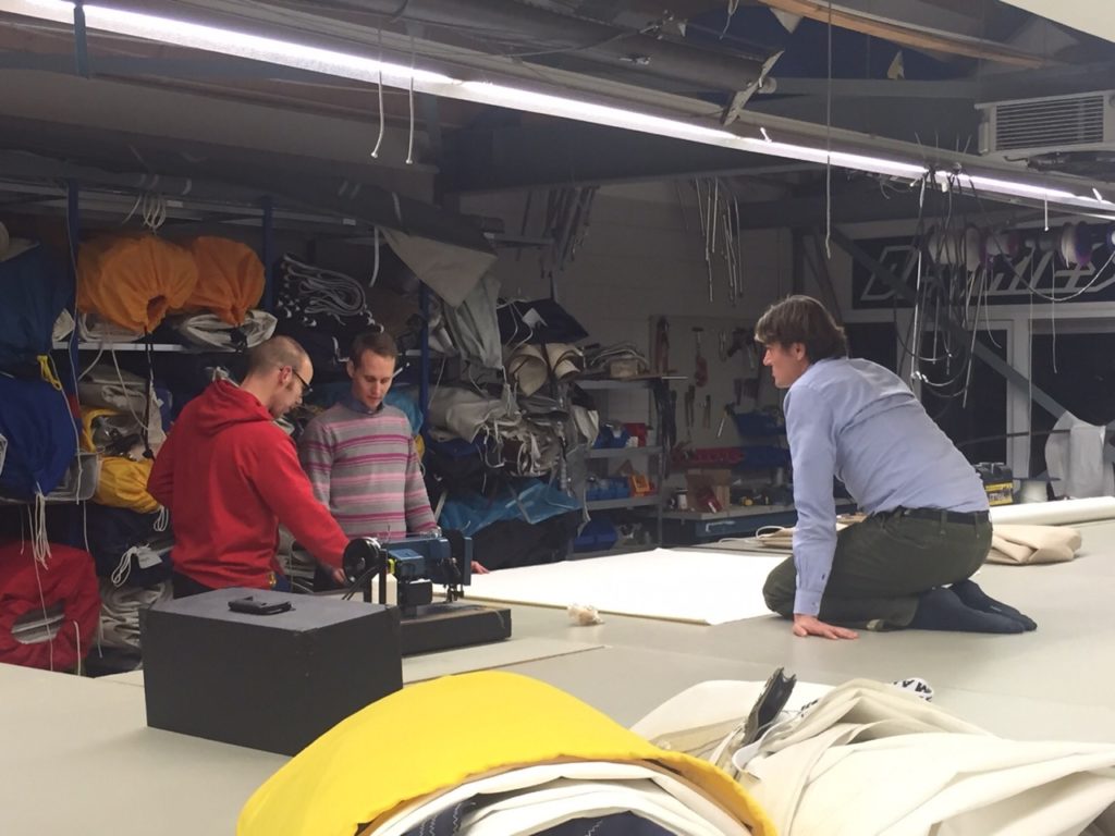 During our first lesson we were introduced to our machine and made our first stitches on some straps (zeilbandjes). How proud we were! This time, we step up a gear and plan to make a canvas that will prevent us from falling out of the bed while sailing (slingerzeil). With Feitze’s help, we design and cut the right shape. Then it’s time to operate the sewing machine. We take turns and help each other remember tricks we learned last time. It’s very exciting to see our progress and to slowly see our canvas take shape. The enthusiasm grows – Floris hardly wants to stop! But Marjan’s apple cake convinces him that it’s time for a break. Mmmhh, lekker!